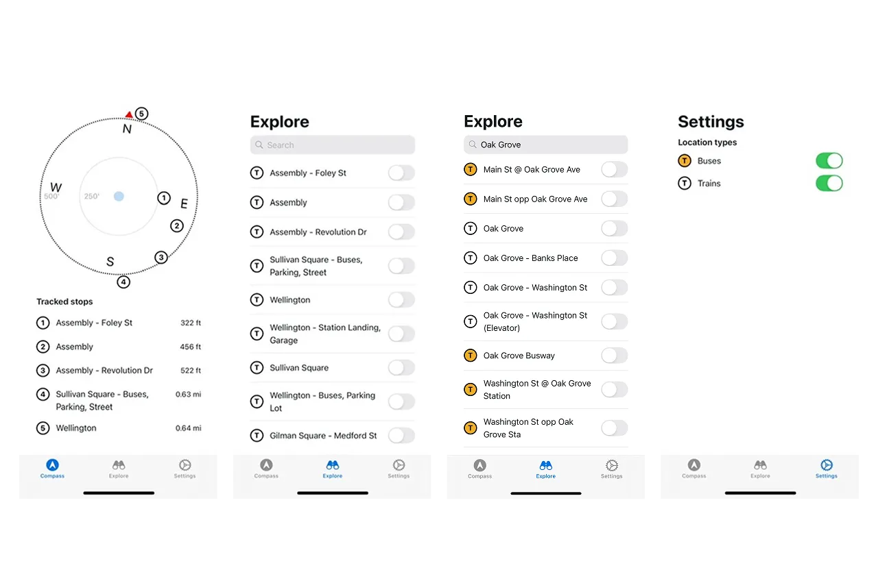 The app consists of 3 tabs: Compass, Explore, and Settings. The Compass tab is the main tab that guides you to your stop. It features a compass with stop markers on it, and a list of stops you’re tracking with their distances from you. The compass’s outer ring represents 500ft away, the markers sit at the edge of the compass until you get below 500ft where they get closer to you until you reach them. The center point representing you grows as your GPS accuracy decreases. Similar to your location point in Apple Maps. The Explore page has a virtualized list of stops sorted by their distance from you, and a search to find specific stops. The Settings page allows you to include buses, trains, or both.